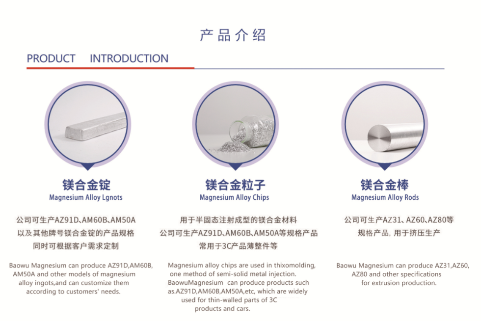 Baowu Magnesium can produce AZ91D,AM60B,AM50A and other models of magnesiualloy ingots,and can customize themccordina to customers' need.